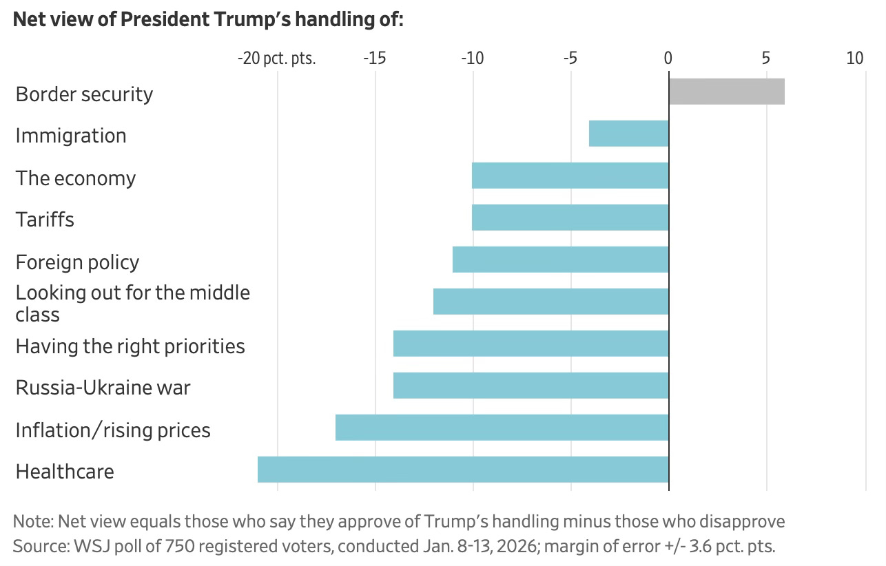 The lone exception? Border security. Everything else polls like unrefrigerated seafood: immigration, the economy, tariffs, foreign policy, inflation, healthcare, the middle class, and the charming little matter of a land war in Europe.